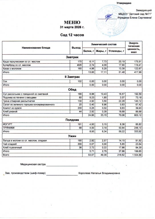 Меню на 31.03