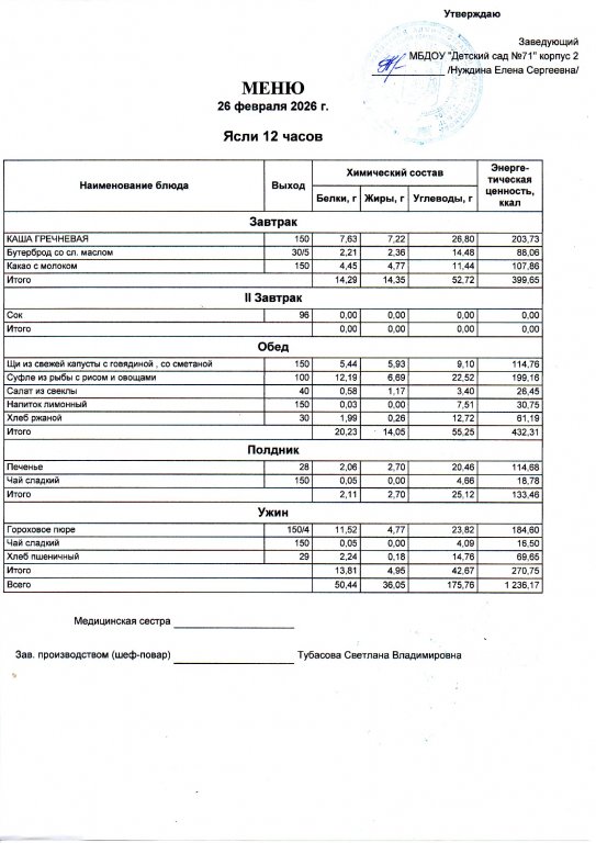 Меню на 26.02. 2 корпус ясли